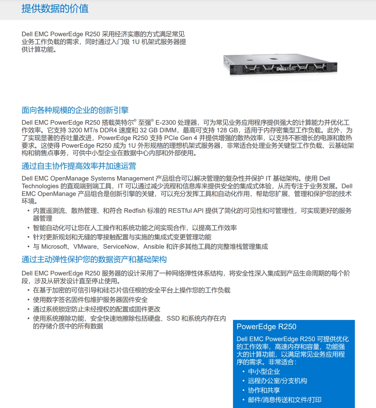Dell EMC PowerEdge R250 采用經(jīng)濟(jì)實(shí)惠的方式滿足常見(jiàn)業(yè)務(wù)工作負(fù)載的需求,同時(shí)通過(guò)入門級(jí) 1U 機(jī)架式服務(wù)器提供計(jì)算功能。